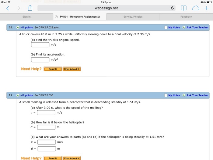 Chapter 2 Problems. 1, 2, 3 = straightforward, intermediate, challenging. Section 2.1 Position, Velocity, and Speed. 1. 20. A truck covers 40.0 m in 8.50 s while smoothly slowing down to final speed . 2.80 m/s. (a) Find its original speed. (b) ... Return Document
